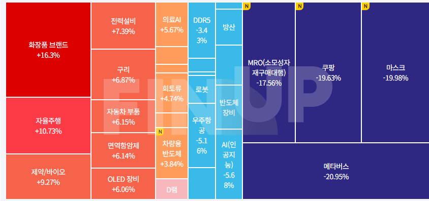 그동안 강세였던 로봇, 반도체장비, 우주항공, AI인공지능관련주가 하락세를 면치 못함.